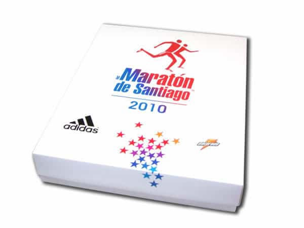 Set Cajas invitación Adidas a corrida de santiago Impresión digital emplacado en cartulina duplex 350 gramos. Diseñada para camiseta de Maratón de Santiago
