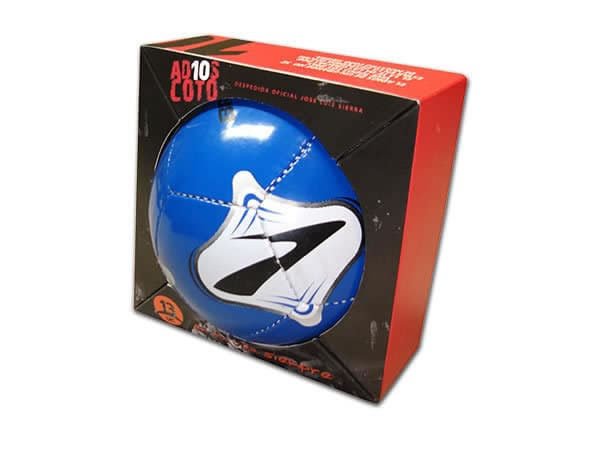 Caja invitación despedida Coto Sierra confeccionada a pedido con troquel especial para pelota y grafica impresa en adhesivo de alta resolución.