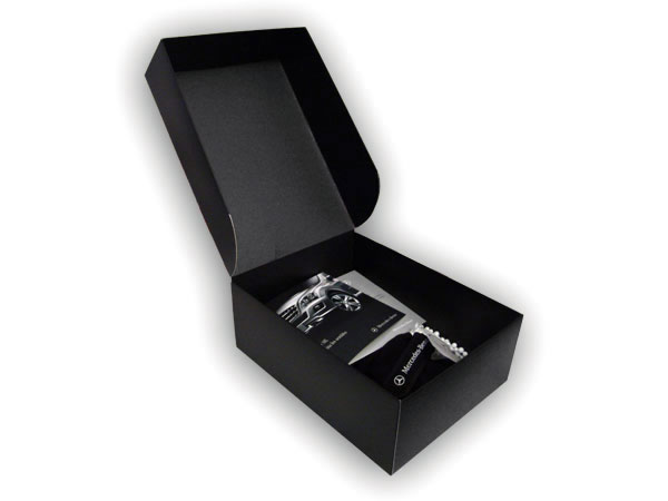 Además, la caja incluye una invitación especialmente diseñada para el evento de lanzamiento. Esta invitación, impresa en papel de alta calidad, proporciona todos los detalles necesarios para asistir al evento, asegurando que los invitados se sientan valorados y anticipen con entusiasmo la presentación del nuevo modelo de Mercedes Benz.