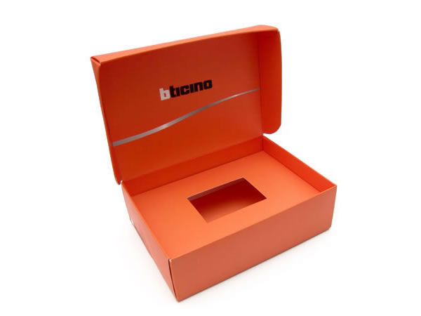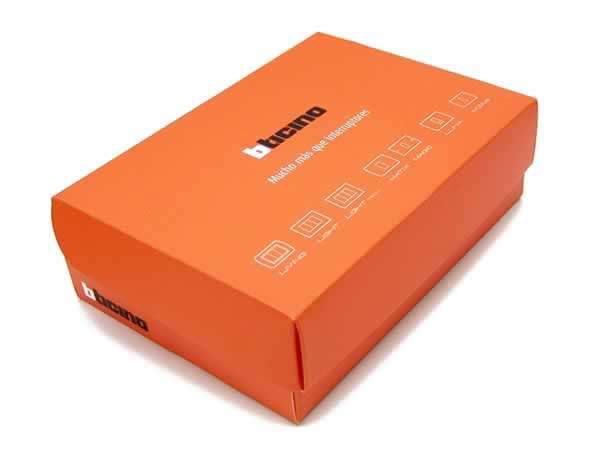 Caja entrega productos Bticino Tamaño: 19×13,5×6 cms impresa en Cartulina duplex 350 gramos mas laminado mate.