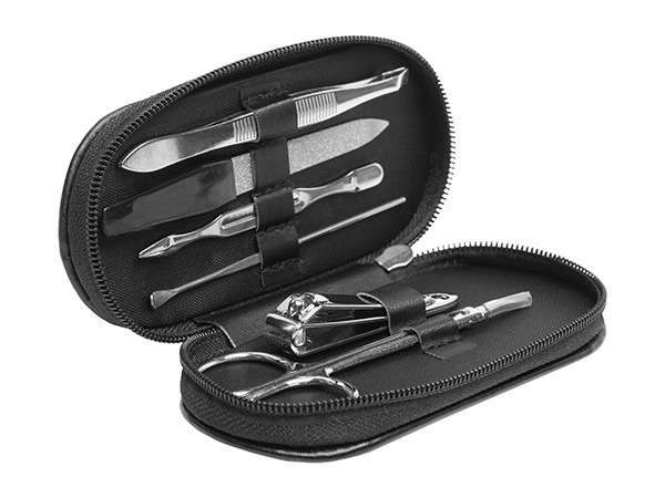 Set Manicure Metal y simil cuero. Estuche organizador con cierre que contiene: tijera, alicate, 2 limpia cutículas, lima metálica y pinza de depilar.