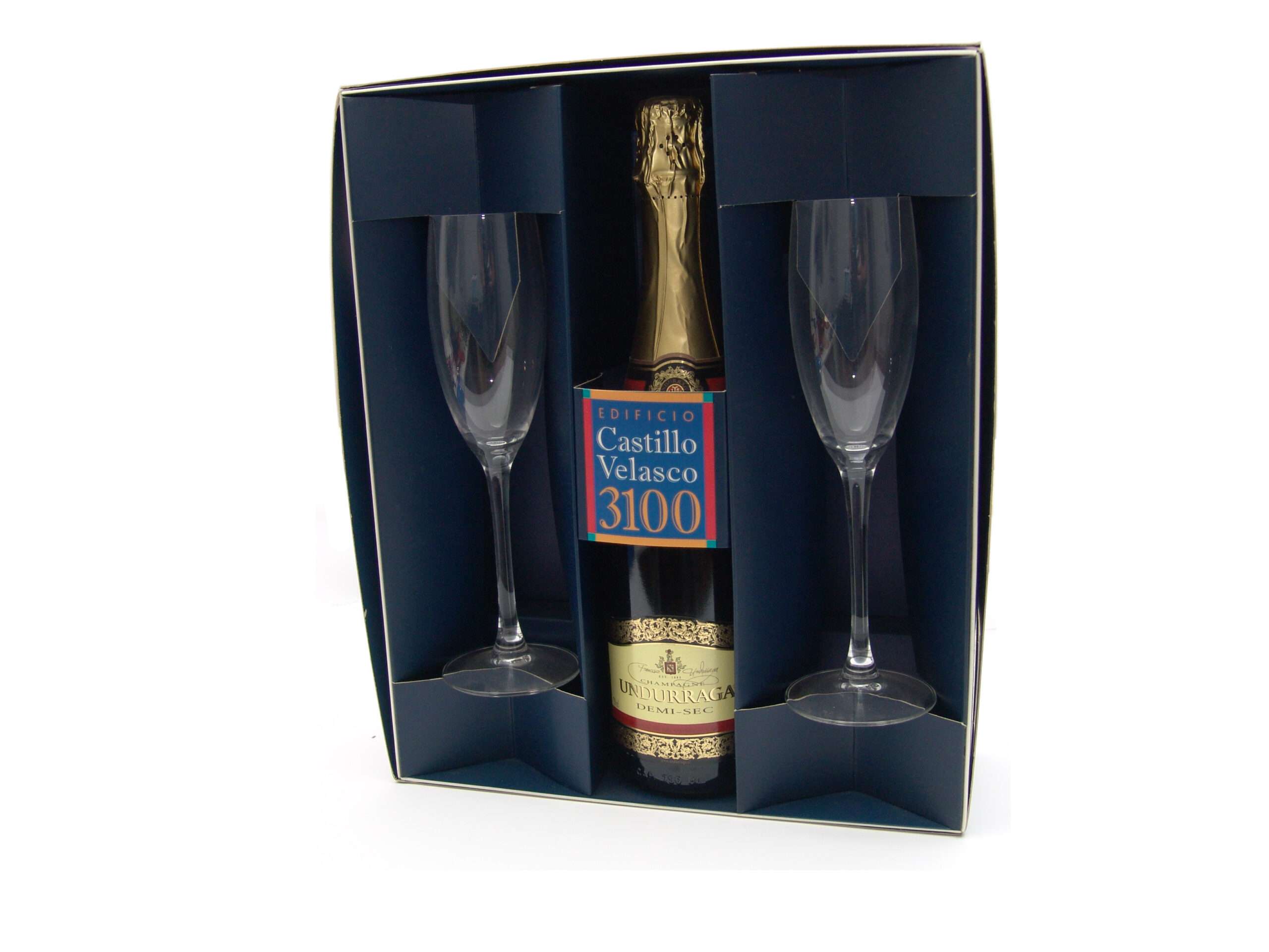 Caja Welcome pack de Cartulina duplex 350 gramos impresa a 4/0 color mas laminado mate por el tiro, cuna interior con espacio para una botella y dos cunas para copas.Tamaño: 27,5×33,2×9 cms.