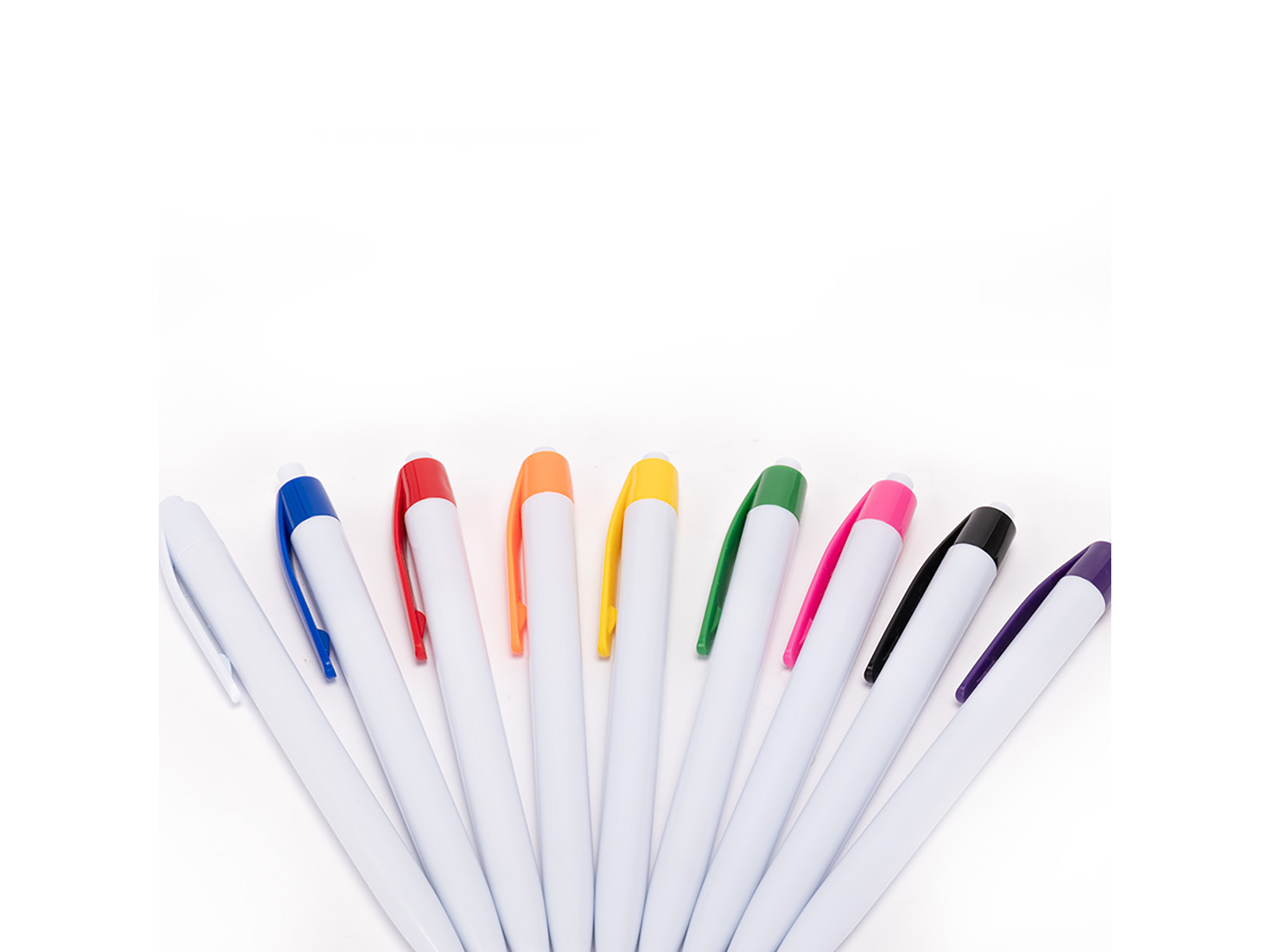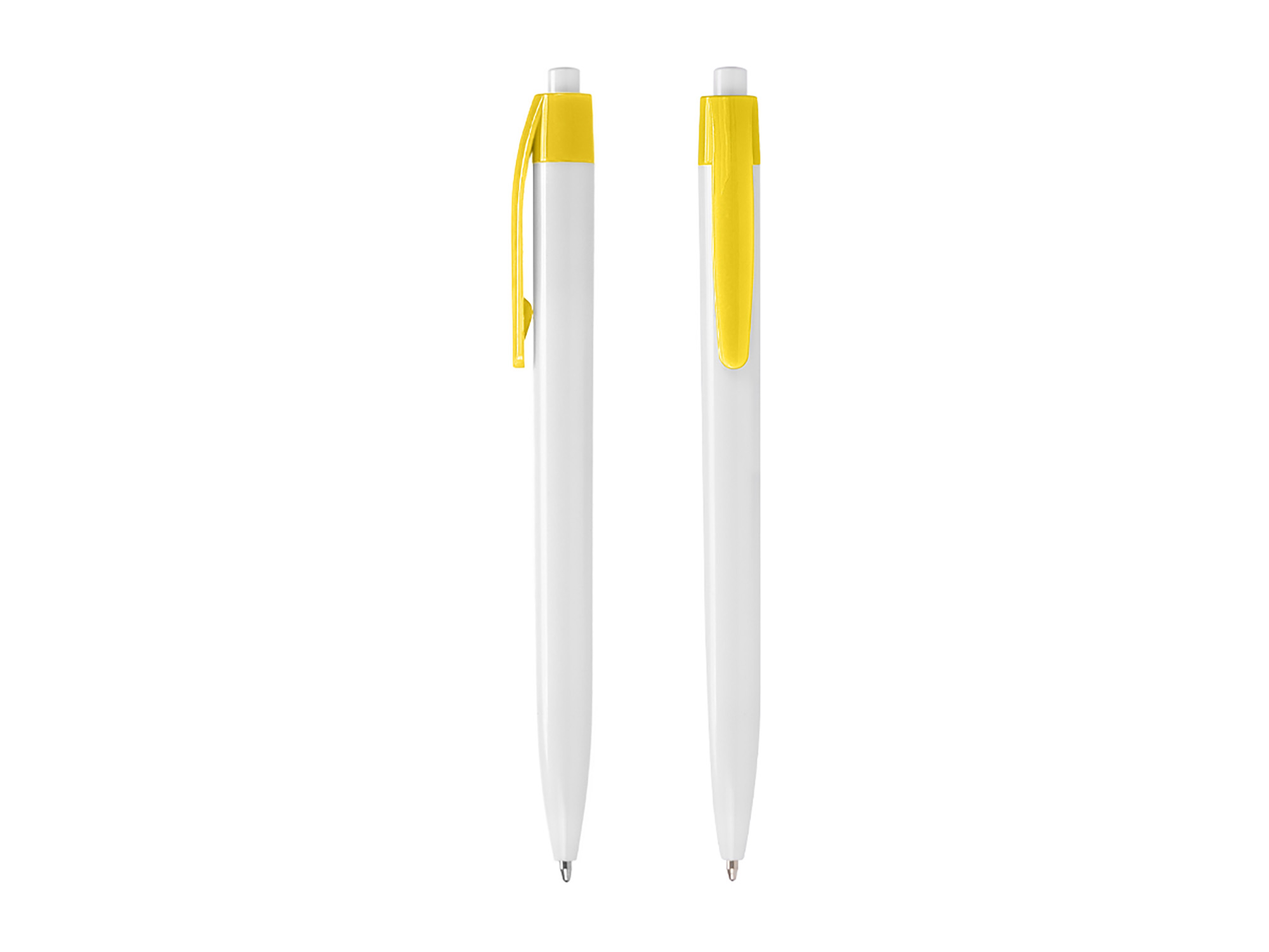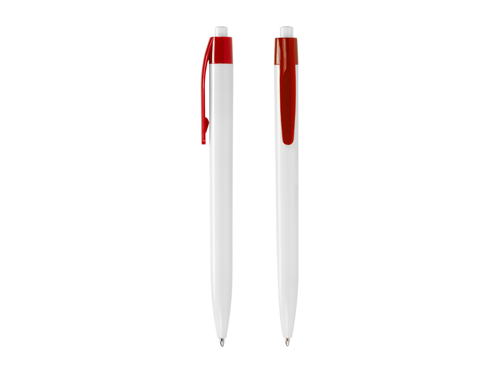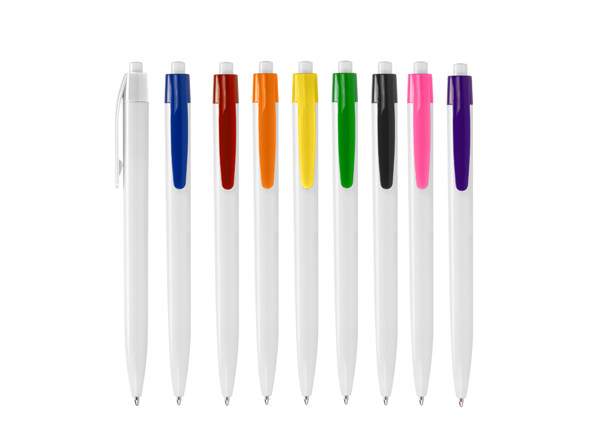 Bolígrafo promocional Tita de plástico cuerpo blanco y clip de color. Escritura azul.