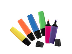 Destacador – Resaltador HIGHLIGHTER punta cincel 5mm, con cuerpo plástico plano de color sólido y tapa plástica negra, con amplia superficie para impresión de logo y mayor cantidad de tinta.