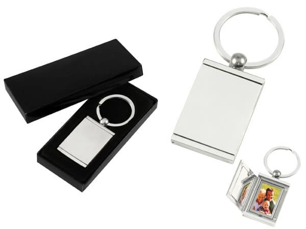 Llavero metálico porta foto Presentación en estuche laminado negro con cuna aterciopelada.
