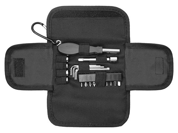 Set Herramientas de Acero y plástico. Set de herramientas de 19 piezas. Destornillador con 10 puntas diferentes, 3 llaves Allen, 4 llaves tubo de 4 medidas y alargue. Estuche con cierre de velcro y gancho.